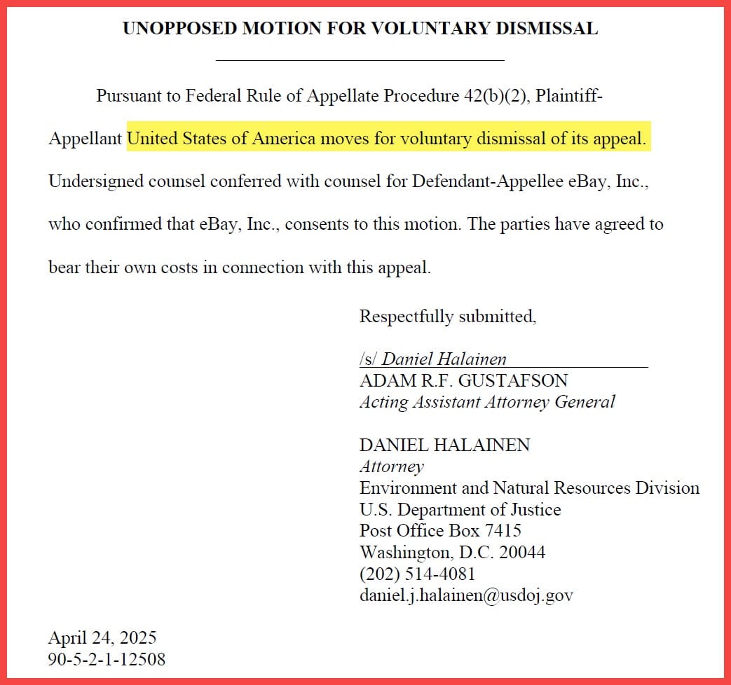 The Department of Justice has filed a voluntary motion to dismiss their appeal of the Section 230-based dismissal of the EPA lawsuit which sought to hold eBay liable for prohibited and restricted chemicals and pesticides as well as illegal emissions control cheat devices sold on the platform.