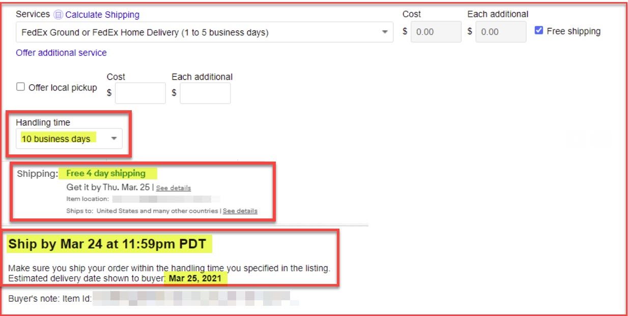 This example was from March 19th, showing the seller was clearly being held to shipping and delivery times much faster than his stated handling time on the item.