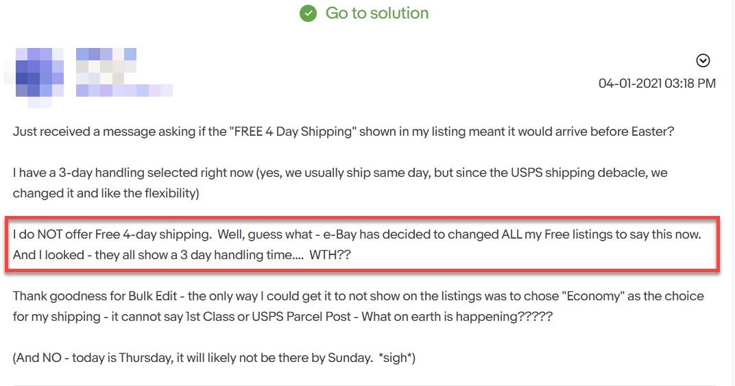 I've seen multiple reports this new feature is causing major headaches for sellers. One seller even says eBay is showing the "Delivery in 4 Days" badge on items that have a 10-15 day handling time!