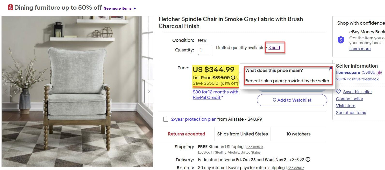 First up a chair the seller says normally lists for $895, currently on sale for $344.99 - a $550 / 61% savings!
