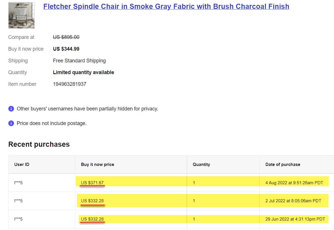 Except when you click to view sold history, you see they've been listing and selling the chair for ~$330-$370 for months.
