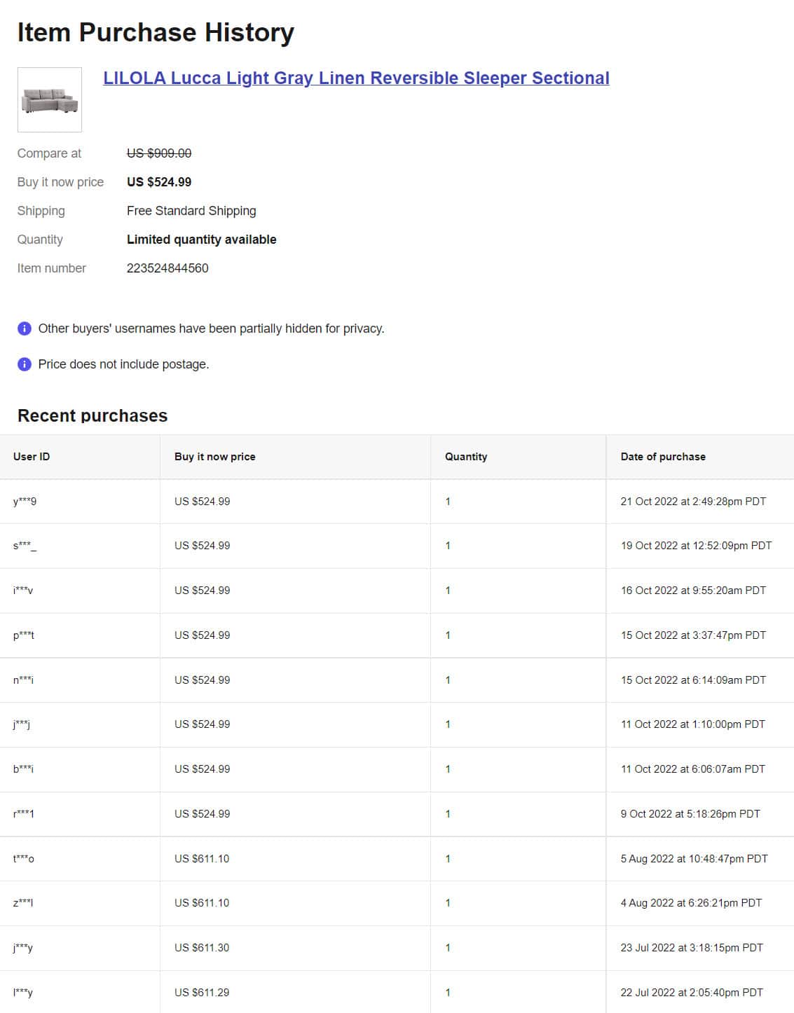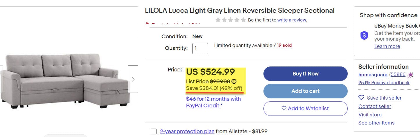 Sold history shows it was once priced at $611.29, then lowered to $524.99 - some savings for sure, but not nearly as much as the advertised discount.