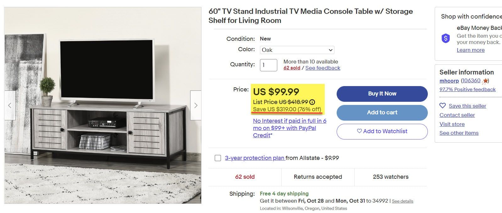 Check out the whopping 76% discount on this TV stand - list price $418.99, on sale for $99.99.