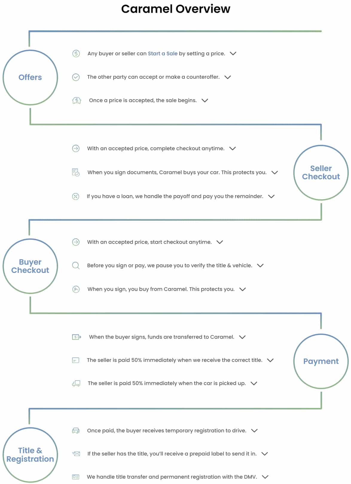 Caramel’s innovative technology platform provides a secure and seamless digital transaction experience that handles all of the complexities of a vehicle sale, including paperwork, ownership transfer, financing, transportation and more, whether transacting on Caramel's site or app, through an independent dealer, or via Caramel's multiple marketplace and auction partners.
