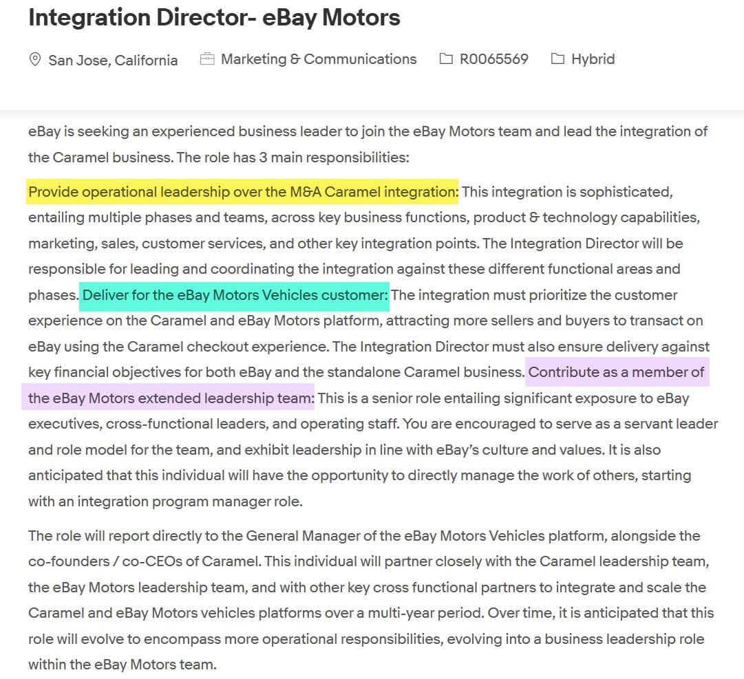 In other news, the company is moving quickly to hire an Integration Director specifically tasked with operational leadership over Caramel business unit integration into eBay Motors division.