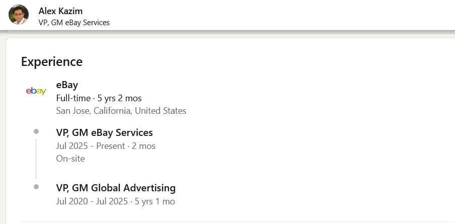 Notably, VP GM Global Advertising Alex Kazim also recently updated his title on LinkedIn to VP GM eBay Services, reflecting the changing nature of his role to encompass the broader scope of both current and future revenue generation efforts based on monetizing services offered to sellers rather than increasing sales on the platform.
