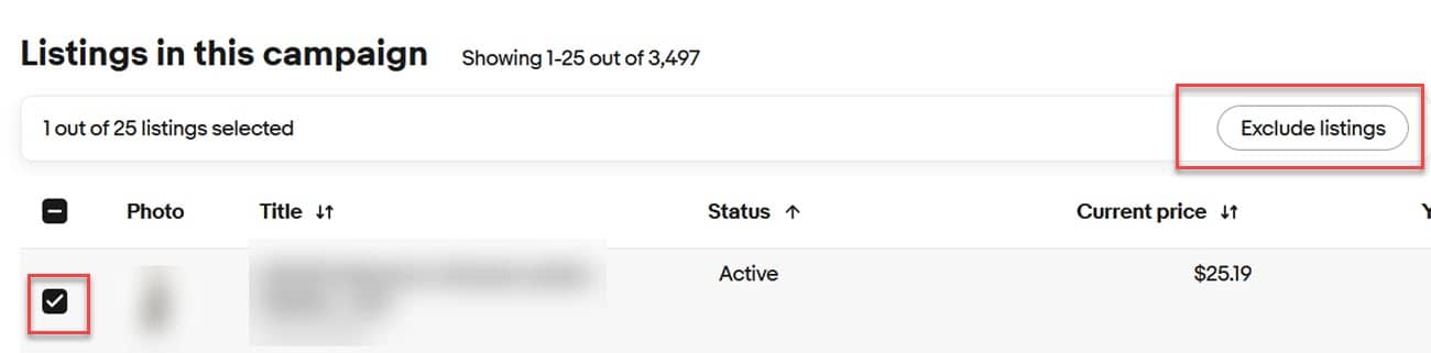 When viewing an existing campaign in the dashboard, you can scroll down to see individual items, check the box next to the ones you want to exclude, and then click "Exclude listings."