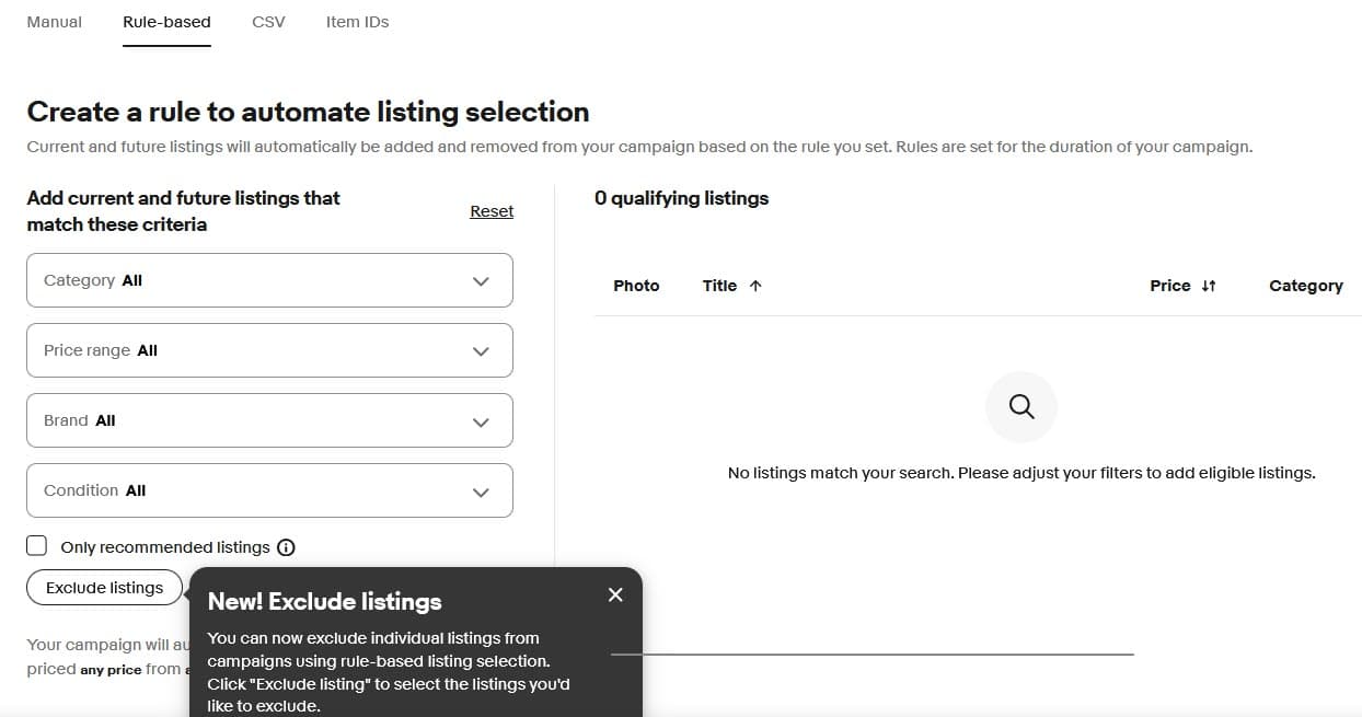 You can also exclude listings in bulk either during campaign creation or in an existing campaign by clicking the "Exclude listings" button within the rule management window.