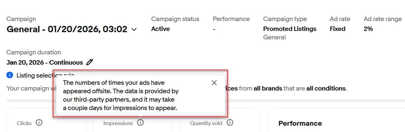 For example, one Value Added Resource reader reports eBay's info pop up for their General campaign currently defines Impressions as "The numbers of times your ads have appeared offsite. The data is provided by our third-party partners, and it may take a couple days for impressions to appear."