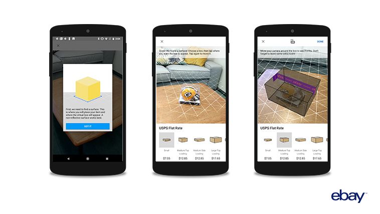 Built on Google's ARCore platform, which enables high-quality AR experiences on Android, eBay is taking advantage of motion tracking and environmental understanding to place a real-world item inside virtual shipping boxes of various sizes