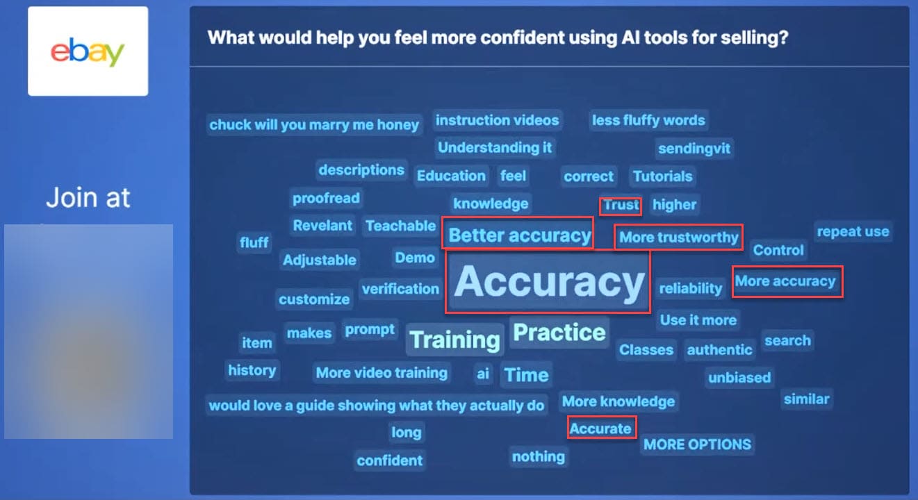 Based on these results, it's clear that accuracy and trust are top of mind for sellers when it comes to using AI tools - and you can bet that is also their number one concern about eBay using AI to summarize descriptions or alter information that is shown to buyers in any way.