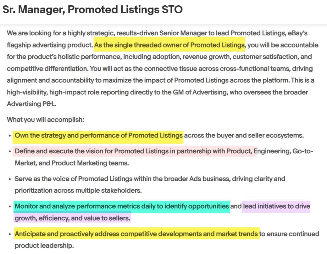 The ad for a Sr. Manager, Promoted Listings STO says eBay is looking for a "single threaded owner" to lead "holistic performance, including adoption, revenue growth, customer satisfaction, and competitive differentiation" for Promoted Listings.