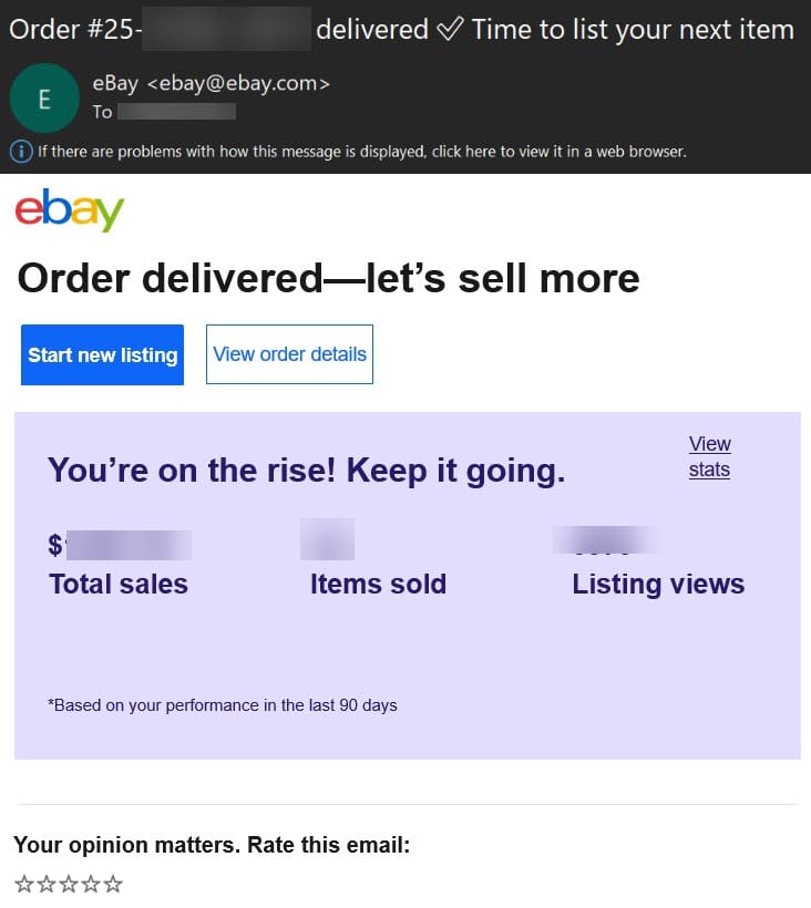 Unfortunately, the email does not provide any other details like the listing title to help the seller see at a glance which item the email refers to - instead simply serving up sales stats and urging the seller to "list your next item."