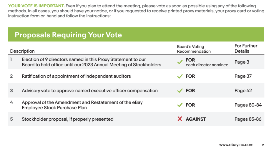 eBay held their annual shareholder meeting on June 8, 2022, taking up important issues such as the election of directors to the Board, appointing PricewaterhouseCoopers LLP as independent auditors, approval of named executive officer compensation, approval of the Amendment and Restatement of the eBay Employee Stock Purchase Plan, and one stockholder proposal.