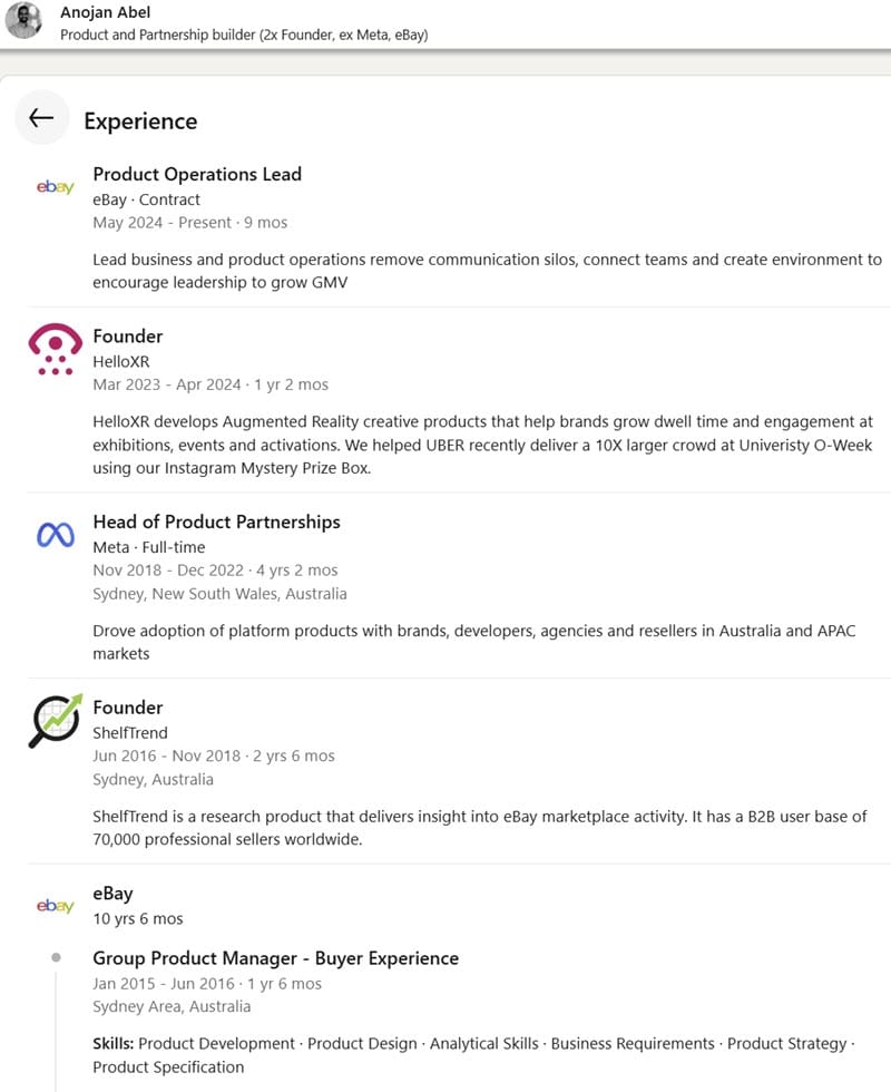 Oddly enough, after leaving ShelfTrend in 2018, a stint at Meta, and founding AR company HelloXR, it appears Abel is back working for eBay on a contract basis, leading product operations efforts to grow GMV.