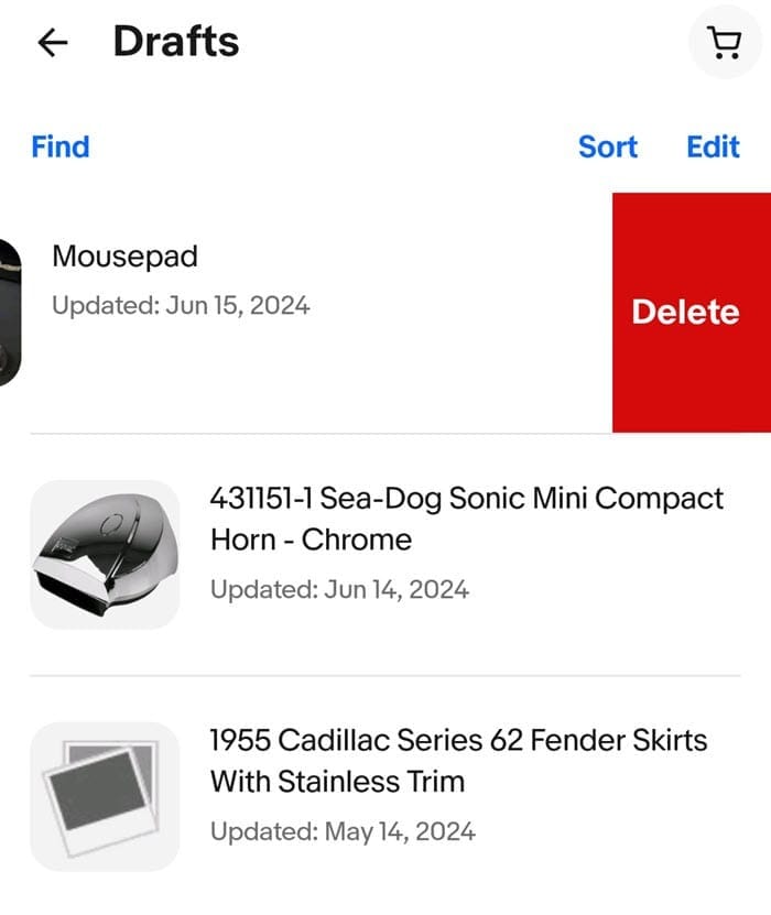 Here's what the design in the Android app experience looks like - swiping left causes the draft to be deleted and these sellers are correct that it is very sensitive with no way to back out once you've swiped far enough to reveal/activate the Delete option.
