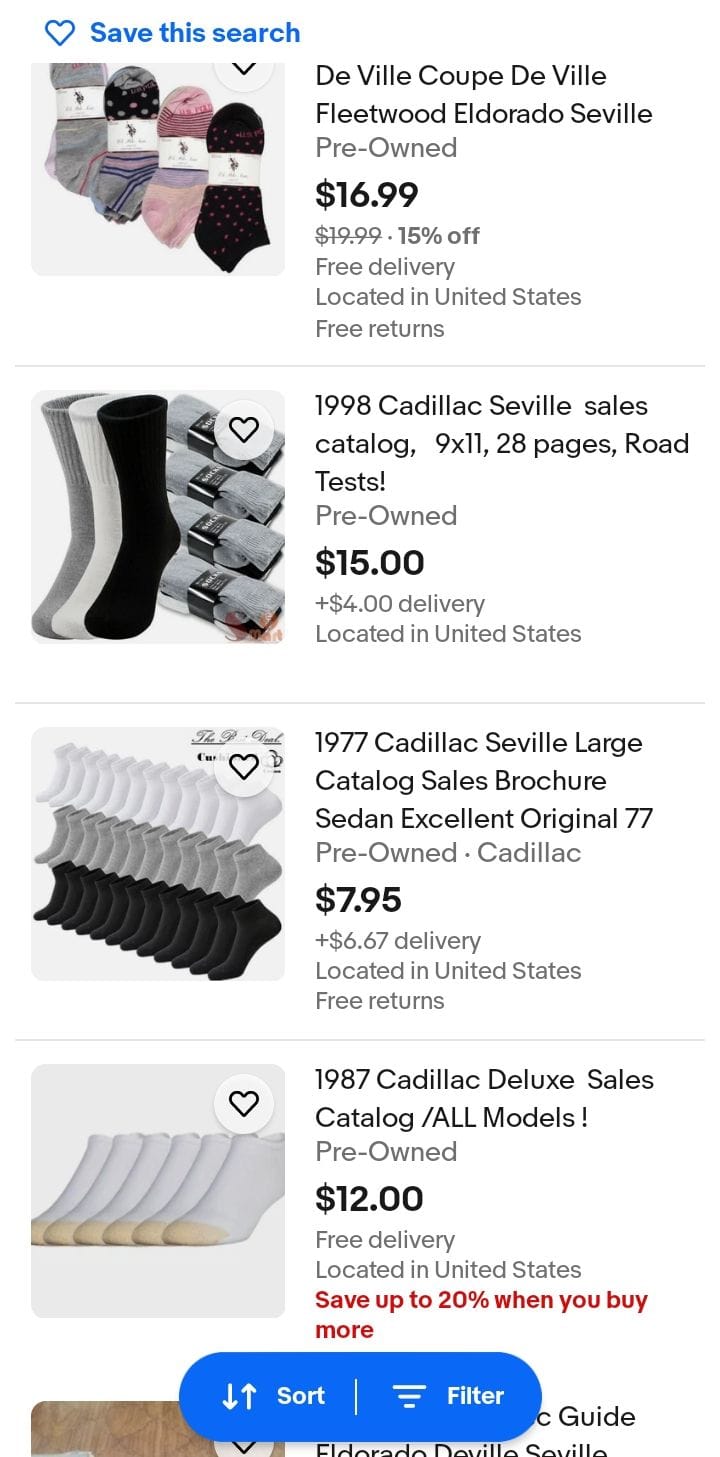 Another user shared a screenshot of the error in the eBay community, showing a search for Cadillac manuals is displaying results with correct titles, but thumbnail images of socks.