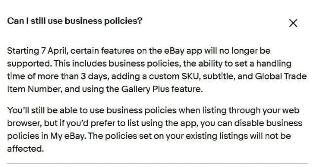 As part of those updates, eBay warned UK private sellers that starting on April 7, they would no longer be able to access business policies through the app and will need to use the web experience instead.