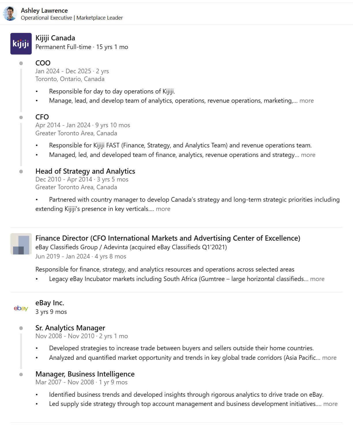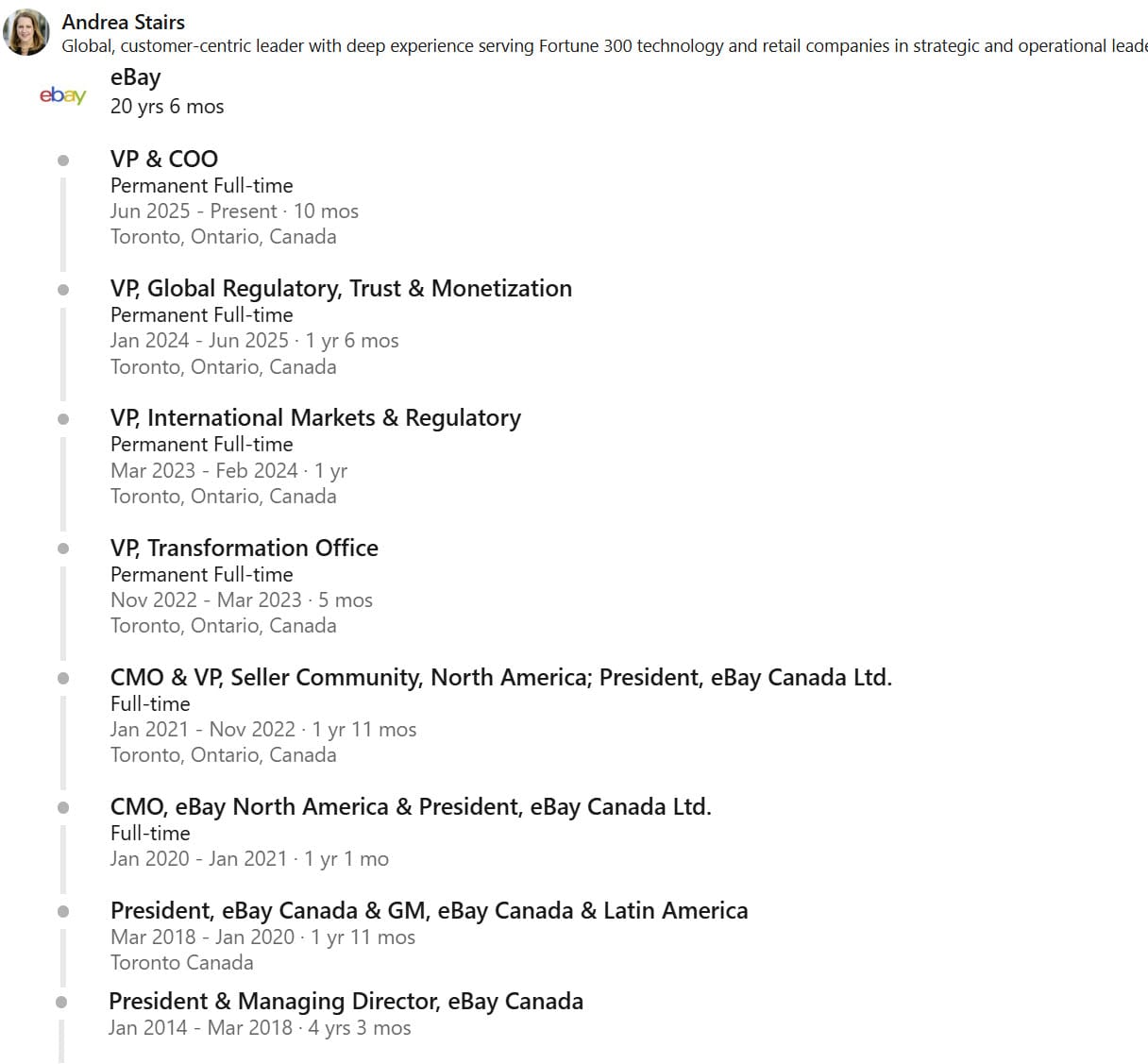 This position has seen significant turnover in recent years. Going back to 2018, Andrea Stairs had been Promoted to Canada GM before then being bounced around to several other positions at the company - including a relatively uninspiring stint as VP Seller Community and Chief Marketing Officer before being replaced in the CMO role by Adrian Fung in 2022 - then VP Global Regulatory Trust and Monetization and finally winding up as VP COO in July 2025.