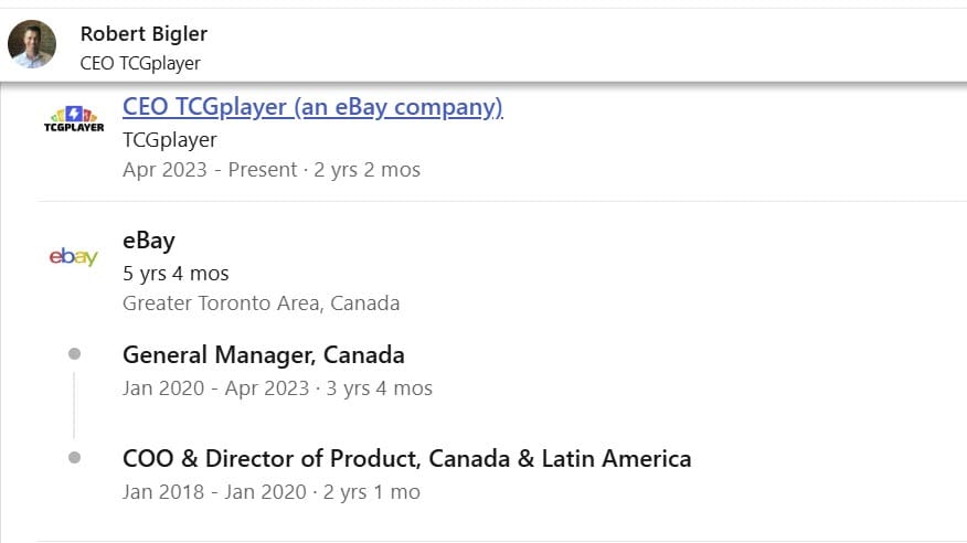 Bigler served in that role until April 2023 when he was promoted to take over as CEO of then newly acquired subsidiary TCGPlayer after former founder/CEO Chedy Hampson abruptly stepped down, along with eBay Chief Account Officer Brian Doerger, following due diligence failures and escalating labor relations issues which led to the formation of the first US union in eBay history.