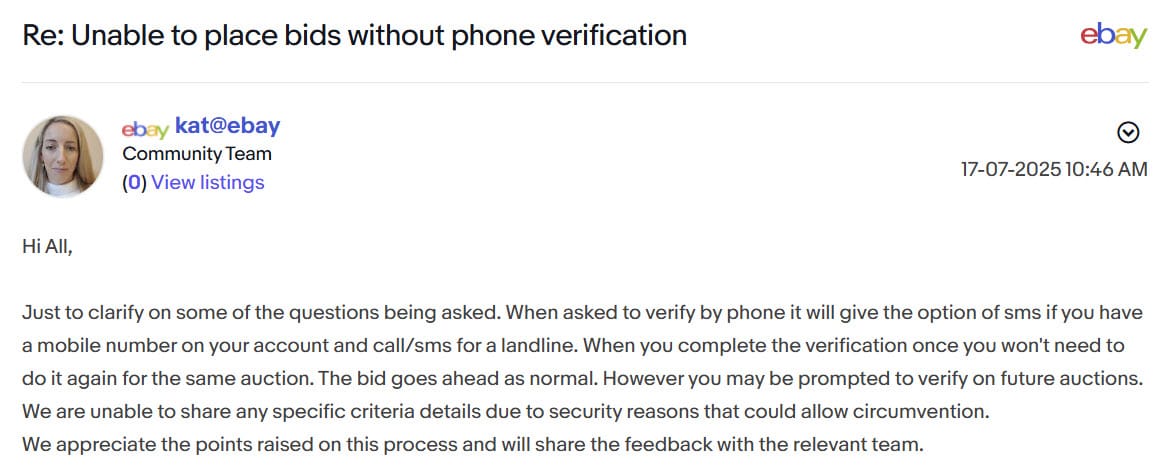 eBay staff have also still not addressed the many reports from would-be buyers who say the never received the text or phone call with the code, thus preventing them from being able to verify and enter a bid.