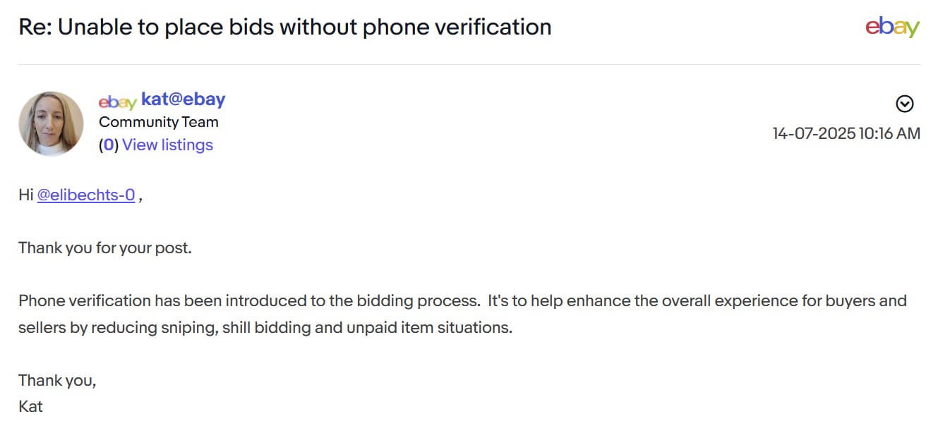 eBay community staff have provided additional information about this phone verification for auction bidding requirement, confirming that the purpose is to verify bids on a specific auction, not a one time identity verification.