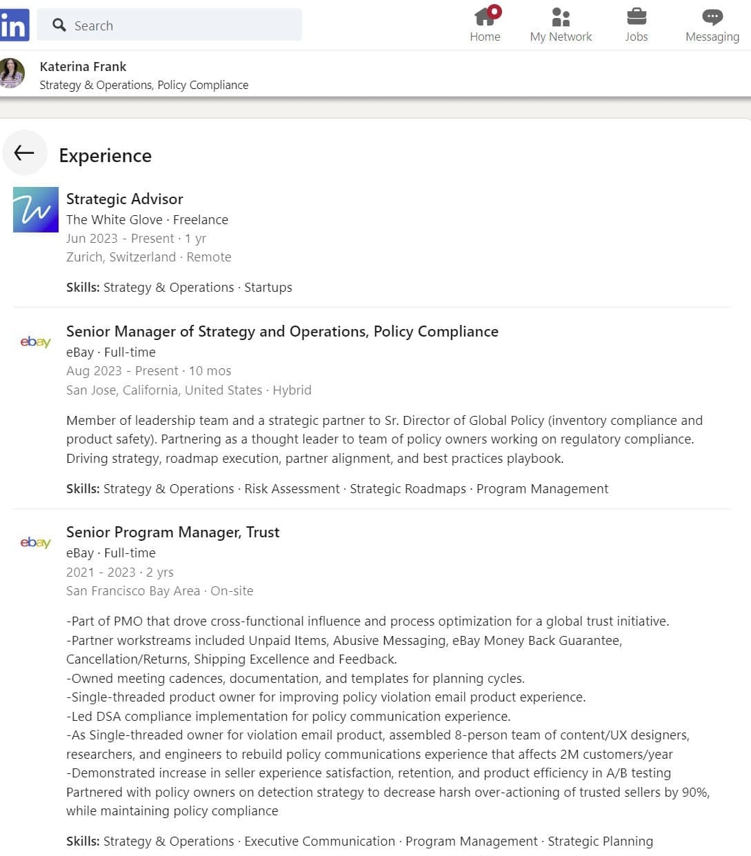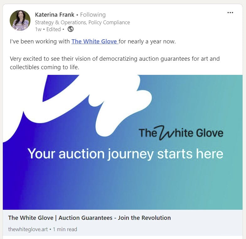 A recent LinkedIn post from eBay Senior Manager of Strategy Operations Policy Compliance, Katerina Frank, shows she's been a strategic advisor for The White Glove, "democratizing auction guarantees for art and collectibles" for over a year while still working at eBay - raising questions about if a partnership or acquisition could be in the works as eBay tries to move deeper into the high value collectible world.