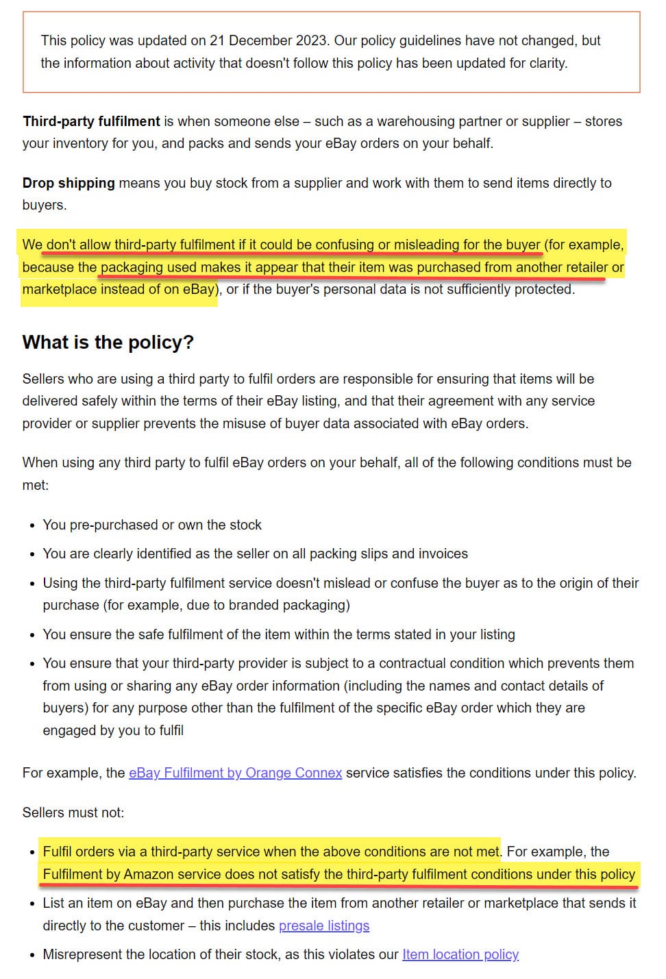 Over the past year, we’ve improved our policy to provide a better shopping experience on eBay. This includes paying closer attention to sellers who use third-party fulfilment methods that don't meet our policy requirements.