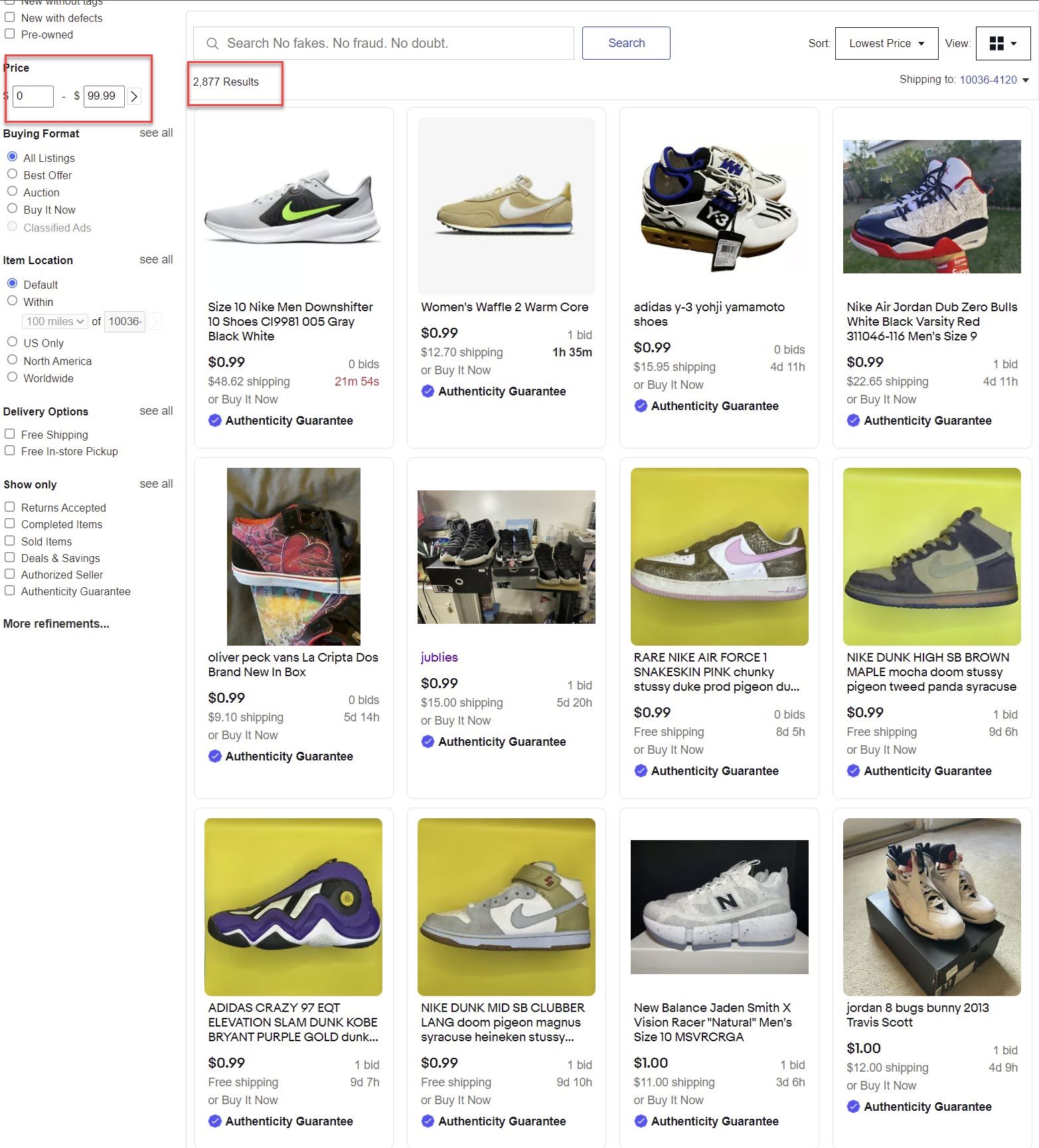 Currently there are over 2800 active sneakers listings less than $100 showing Authenticity Guaranteed - some starting as low as $0.99!