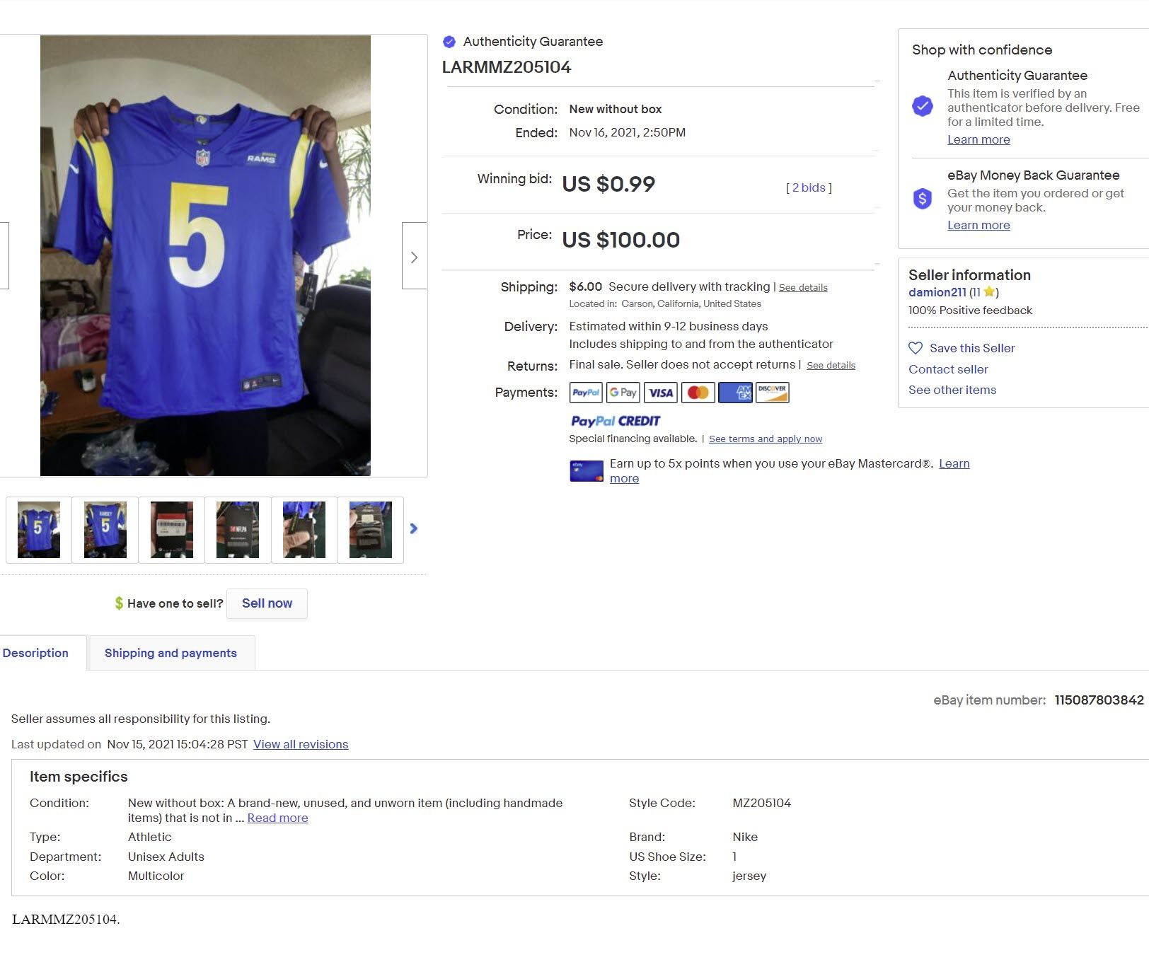 Searching sold history shows in the last 90 days, there have been over 4800 listings sold with Authenticity Guaranteed that are less than the $100 minimum, including a listing for a jersey that shouldn't have even been in this category - I wonder what the authenticator did with that one?