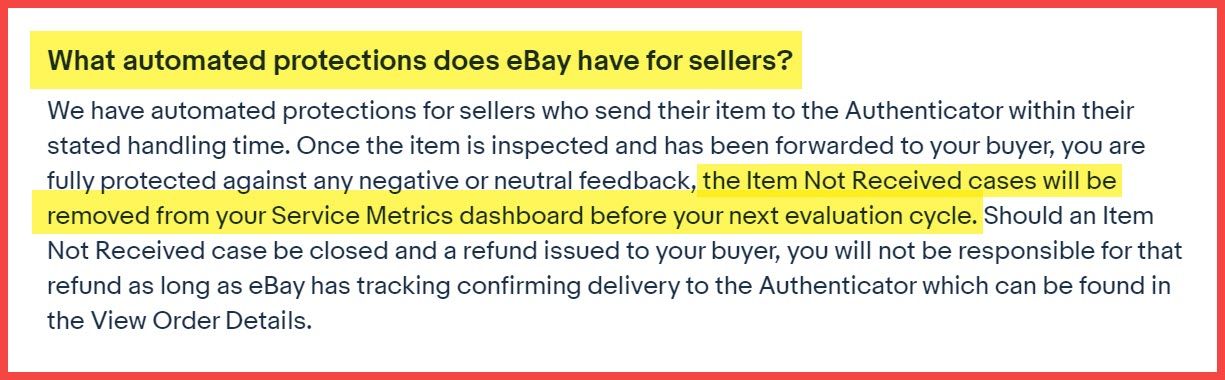 To add insult to injury, the eBay Authentication Guarantee FAQ for Sellers makes it explicitly clear that Service Metrics will be automatically protected for Item Not Received cases....showing eBay absolutely does have the ability to adjust these metrics, when and if they want to.