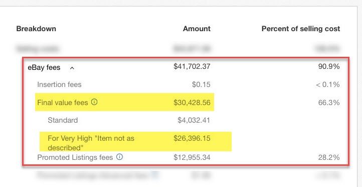 They do a large volume in sales, which is very impressive, but it also means that 5% adds up fast. Of the $30,428.56 in final value fees this seller paid in a quarter, $26,396.15 was due to the "very high" not as described rating. That is insane!