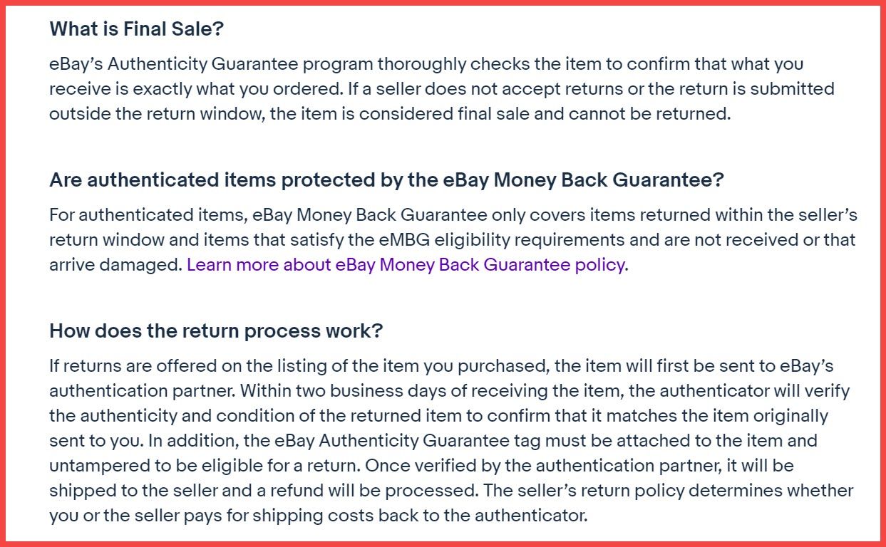 eBay’s Authenticity Guarantee is a service designed to protect sellers and allow buyers to shop with confidence. Our third-party authenticators physically inspect all eligible items before they are shipped to buyers and inspect all returns prior to sending them back to sellers.