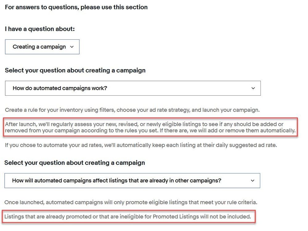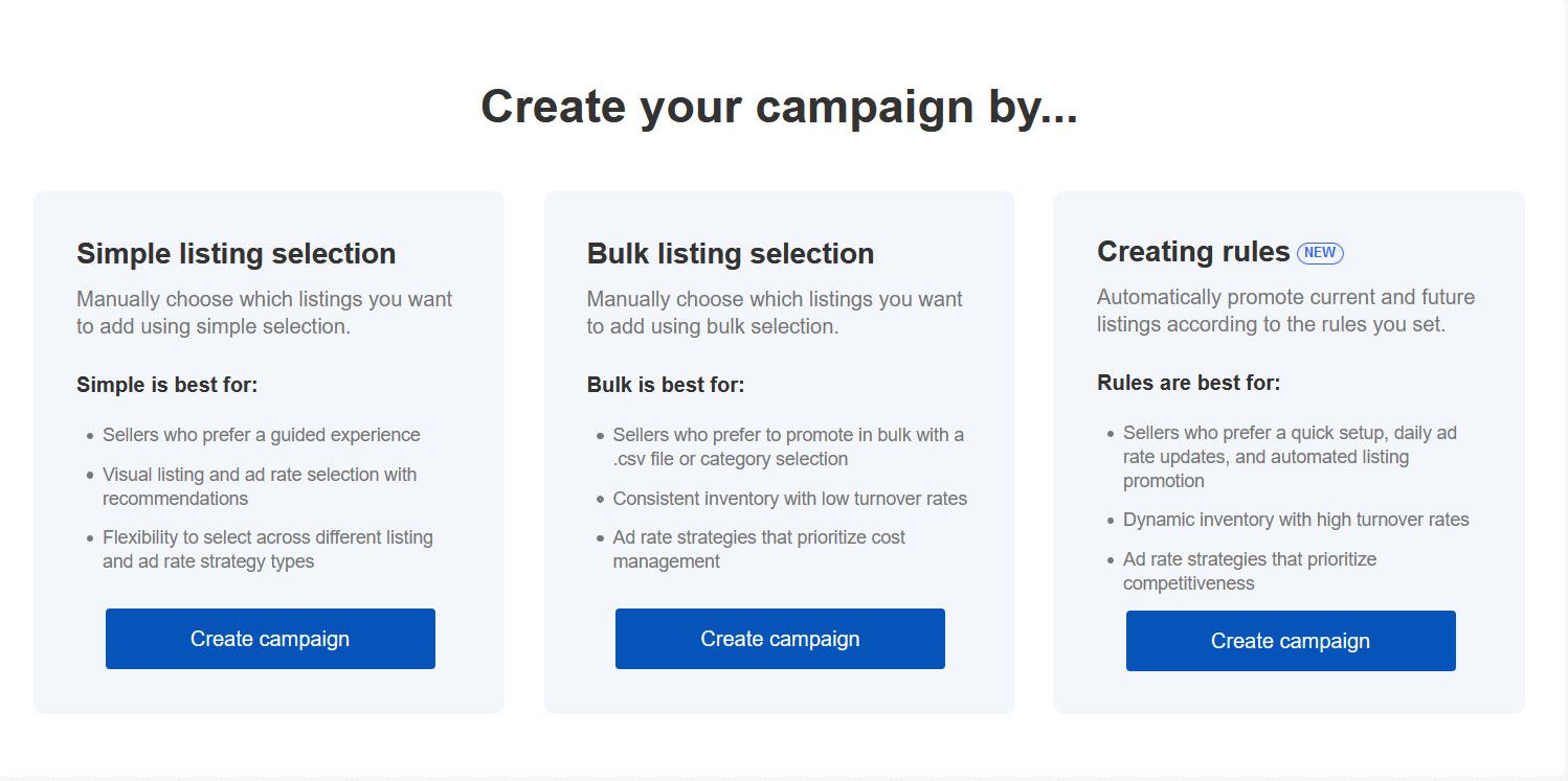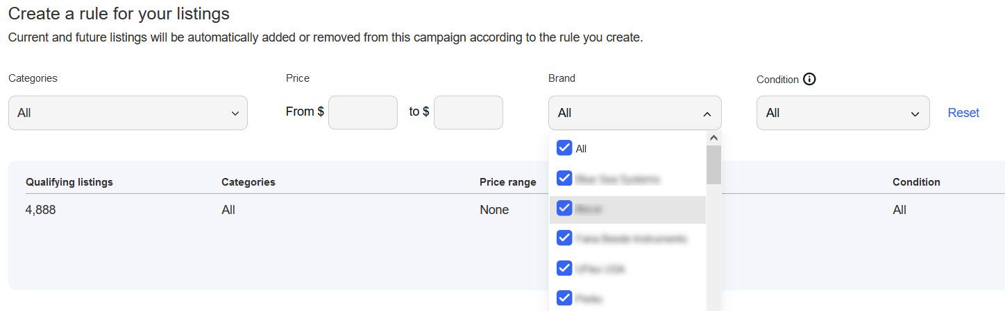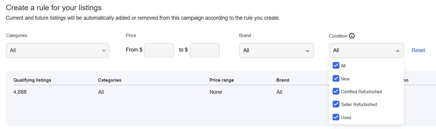 The rules allow filtering by categories and/or price ranges. Once you set up a rule, all future listings that fit within the designated parameters will automatically be included in the campaign.