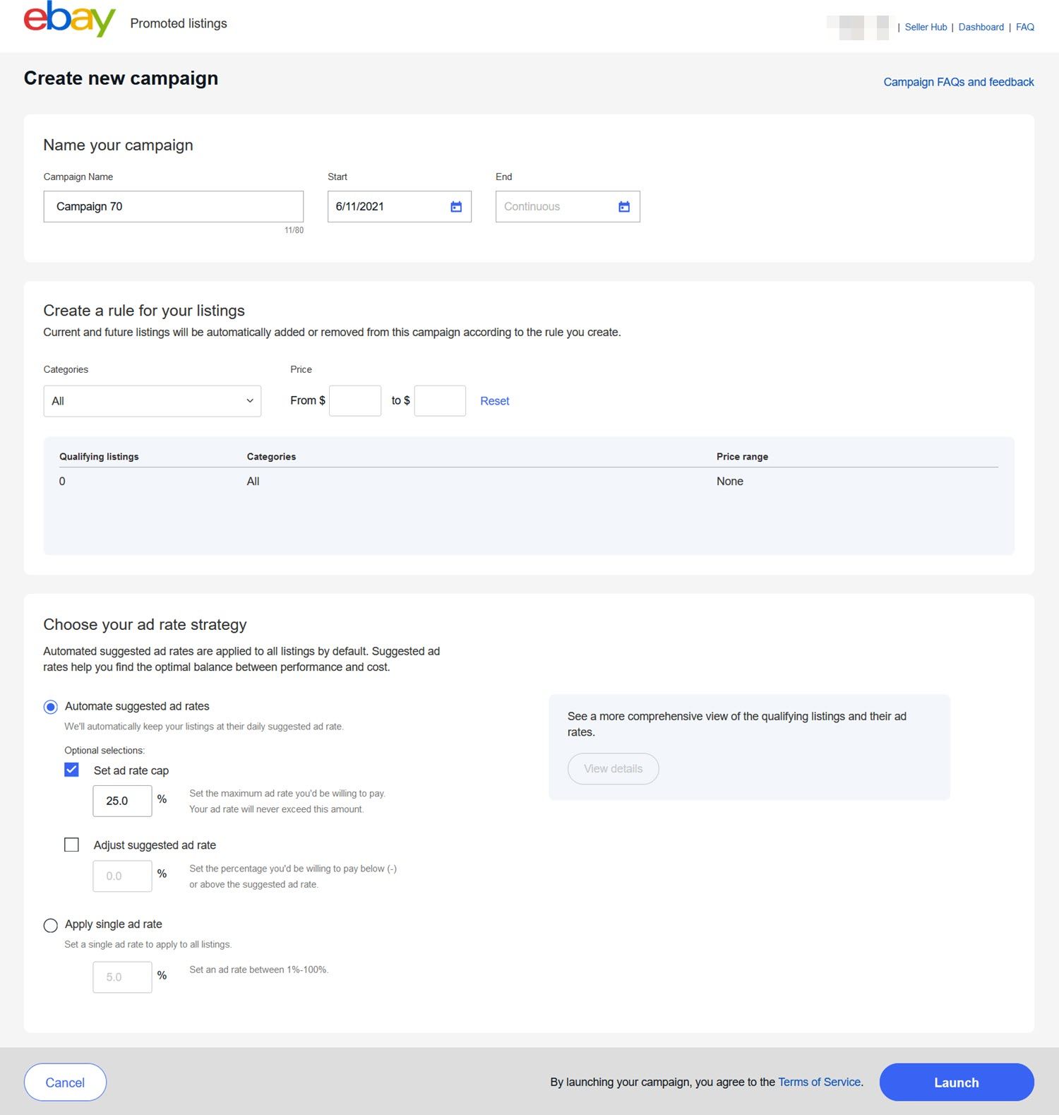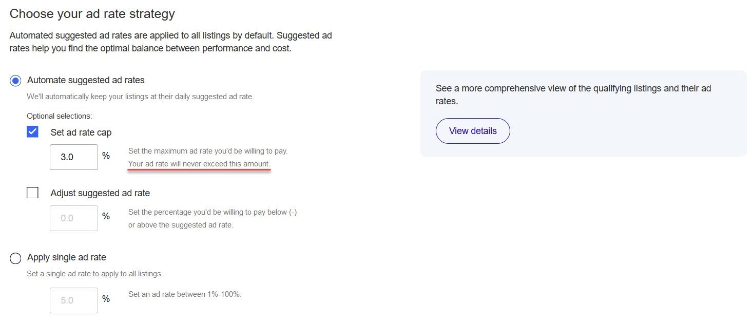 You can either set a single ad rate to be applied to all listings in the campaign or use eBay's suggested ad rates. If you use eBay's suggested rates, they are updated daily and you can set an ad rate cap or adjust how much you are willing to go above or below the suggested rate.