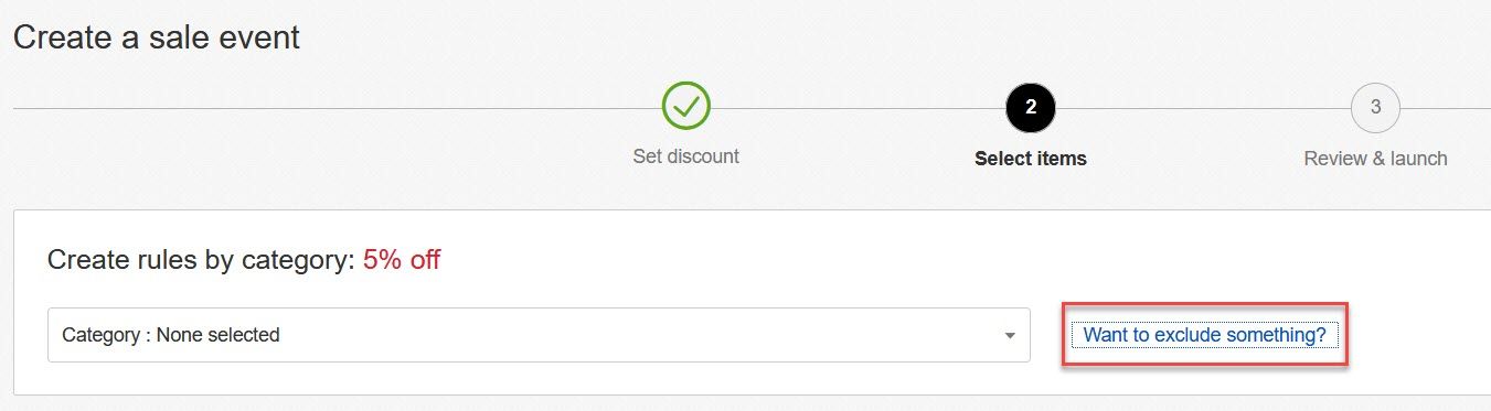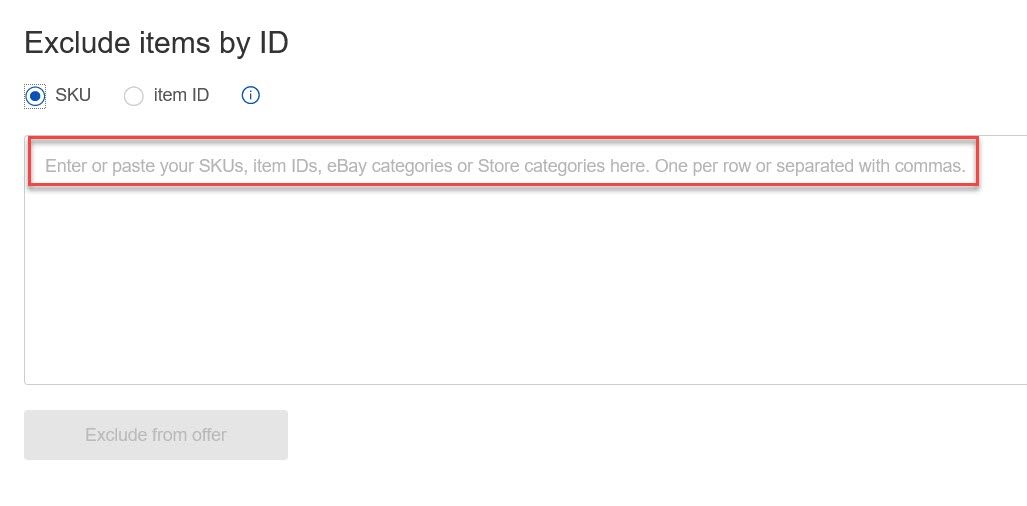 For Markdown Sales promotions eBay also has an option to use rules to designate which listings are included in the sale. They also provide an easy way to exclude items by SKU, item ID, eBay category or store category by simply pasting a list of items to exclude.