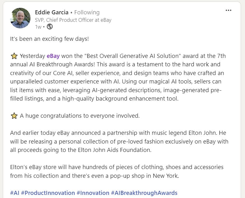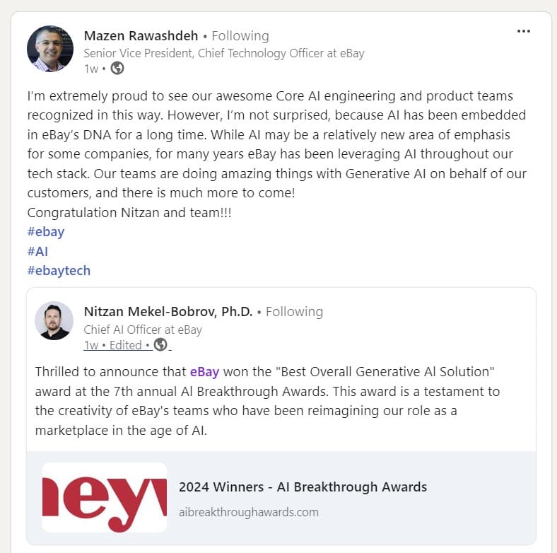 eBay execs including CTO Mazen Rawashdeh, Chief AI Officer Nitzan Mekel-Bobrov, and Chief Product Officer Eddie Garcia were quick to announce the win on their LinkedIn profiles, but strangely there have been no corporate press releases, announcements or further media promotion around what would appear to be a significant honor.