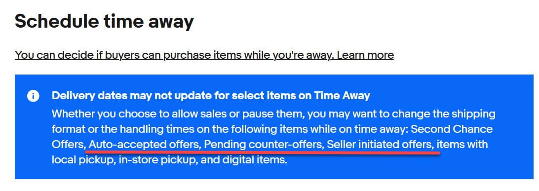 Offers in limbo can also present challenges if a seller needs to put their shop on Time Away because extended delivery dates don't apply to auto-accepted offers, pending counter-offers, or seller initiated offers.