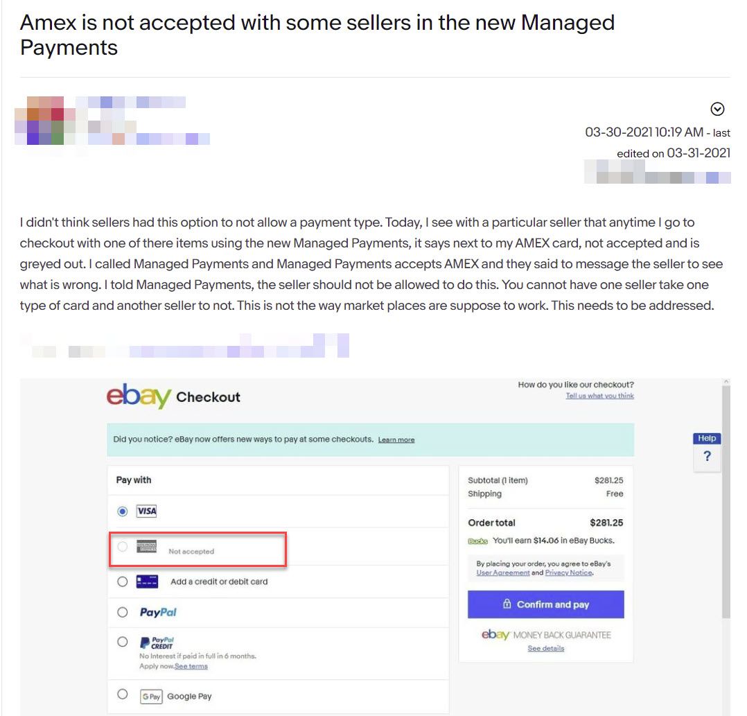 There was speculation in that eBay community post that eBay may be blocking American Express from these categories because Amex typically charges higher processing fees than other credit cards. It may also be worth noting that American Express typically takes longer to process and clear payments than other credit cards.