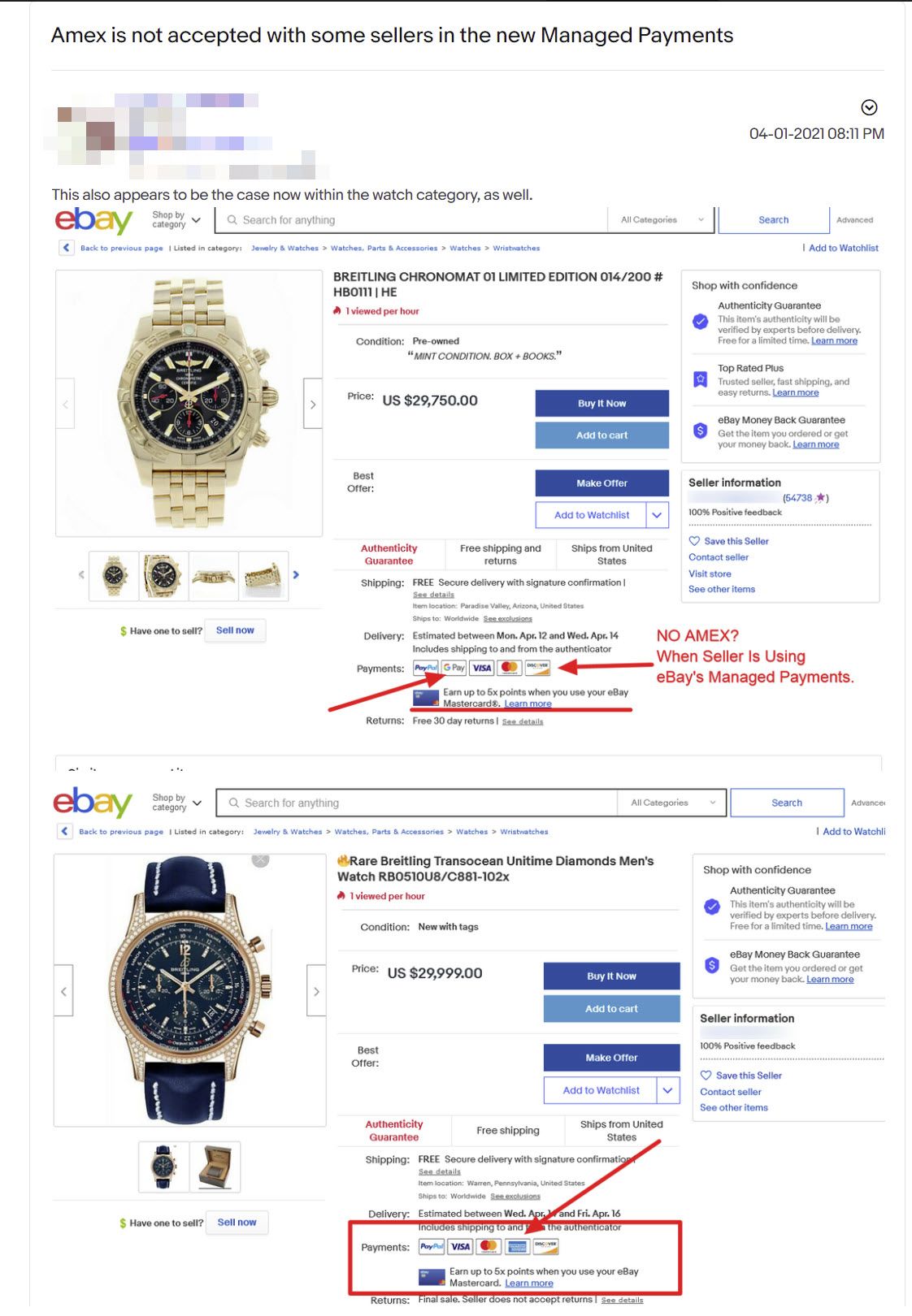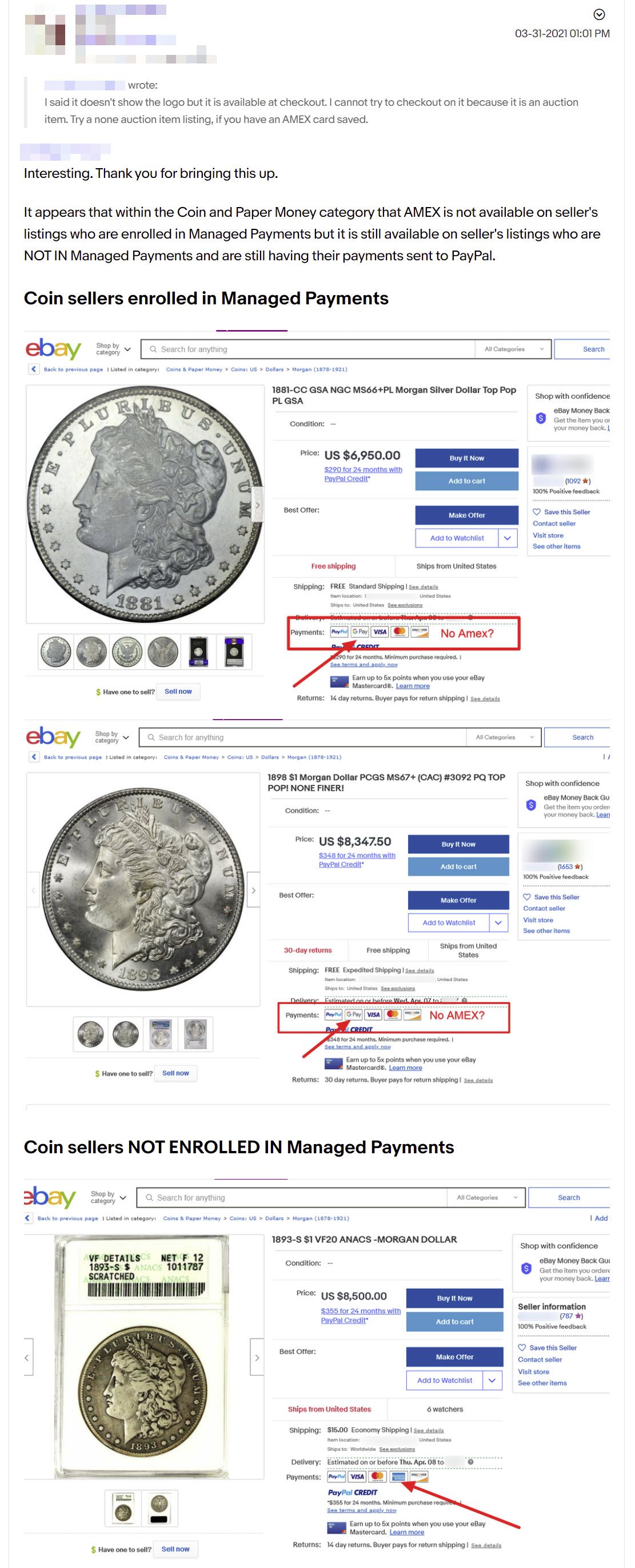 However, it's not clear if either of those is a factor in eBay's decision not to allow American Express payments for Managed Payments sellers in these categories.
