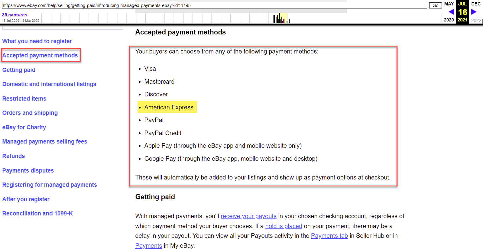 July 16, 2021 - shows list of sections on the left side, including Accepted Payment Methods.