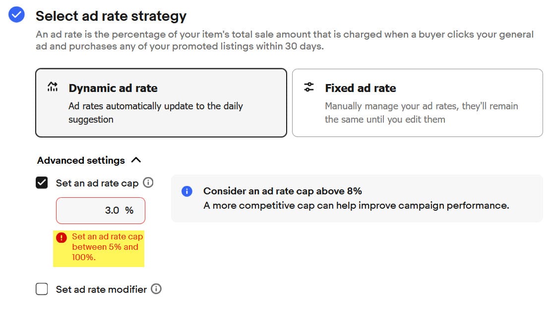 eBay introduced Dynamic ad rate in 2023, allowing sellers the option to have their Promoted Listings ad rates automatically updated to eBay's daily suggested rates - with additional options to set either an ad rate cap (amount it won't go above, even if the suggested rate is higher) or an ad rate modifier (amount the rate is allowed to go above the suggested rate.)