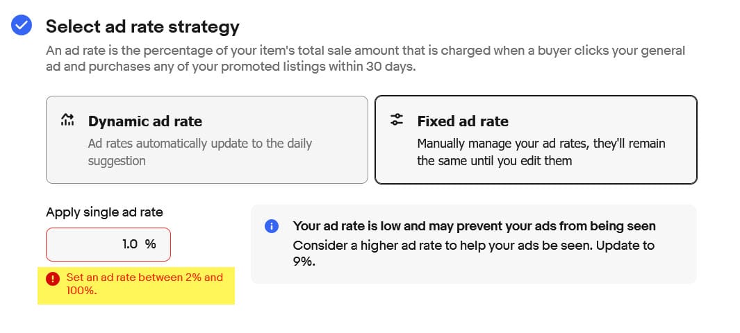 And that appears to be where the change has occurred - fixed rate Promoted Listings General campaigns still have a minimum of 2%.