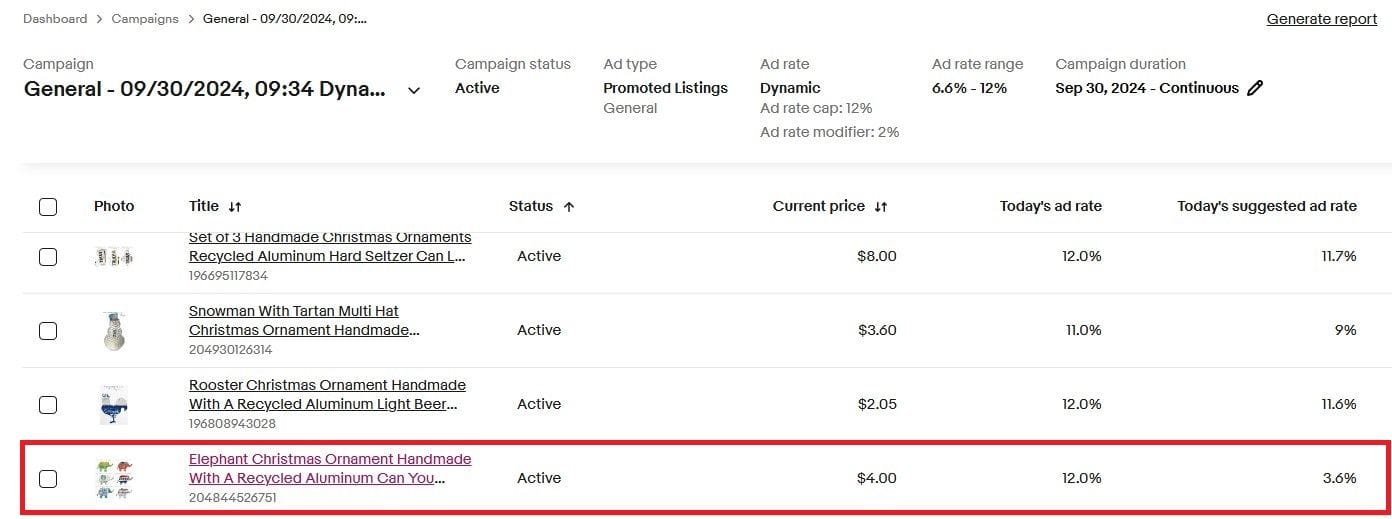 I have my Dynamic campaign set with a 12% ad rate cap + a 2% ad rate modifier. The listing I highlighted in the screenshot below has a 3.6% suggested rate for today.