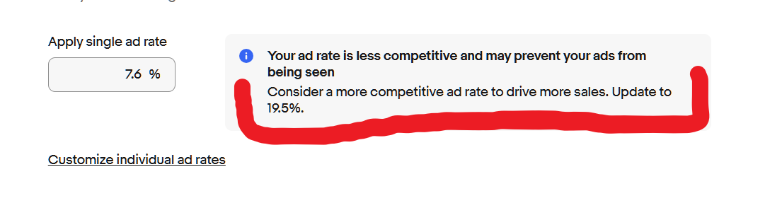 While they're not sure if it is just a display error or will actually impact the ad rates they end up being charged, it appears eBay is incorrectly showing the expected ad rate at the maximum cap they have set, rather than the suggested rate that it should be.