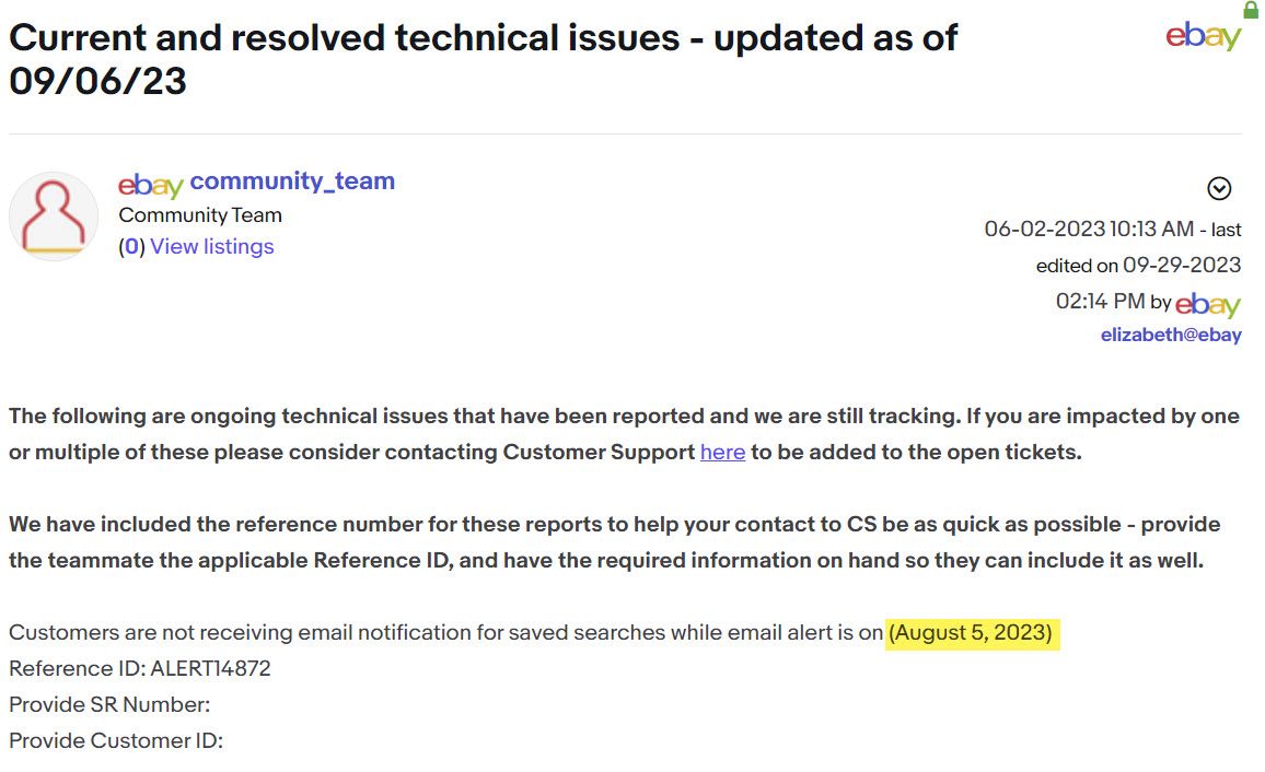 eBay buyers are reporting they no longer receive emails with results for their saved searches and support is unaware of the problem despite almost 2 month old still open technical ticket.