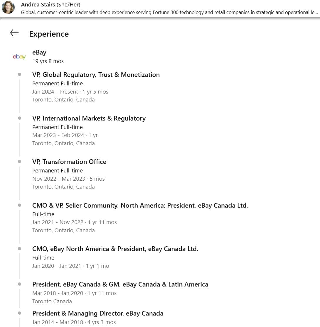 Going back to 2018, Andrea Stairs had been Promoted to Canada GM before then being bounced around to several other positions at the company - including a relatively uninspiring stint as VP Seller Community and Chief Marketing Officer before being replaced in the CMO role by Adrian Fung in 2022 - then finally winding up as VP Global Regulatory Trust and Monetization.