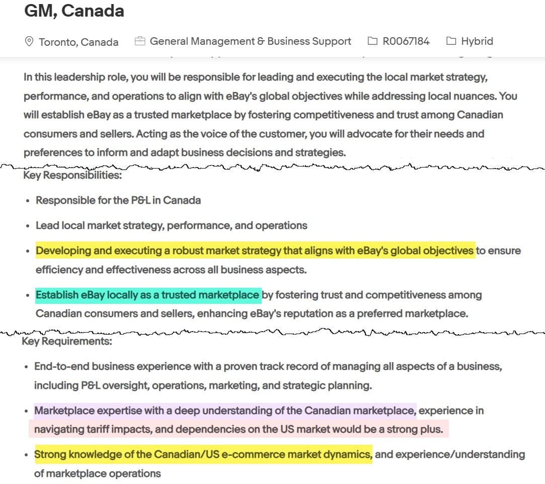 The key responsibilities and requirements for the role also showed that eBay is looking for someone who can handle both localized and global objectives, with strong knowledge of the interplay between the US and Canada markets.