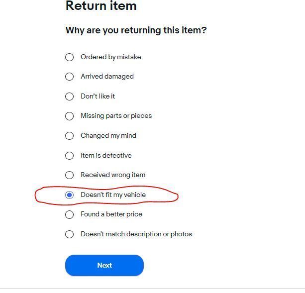 That a new option has appeared yesterday which now states "doesn't fit my vehicle" which is fine makes more sense, but whats not fine is this option is now asking for the seller to pay for the return postage even though from my own personal experiance 9.5 times out of 10 when an item has not fit a vehicle its down to a customer not reading the description correctly.