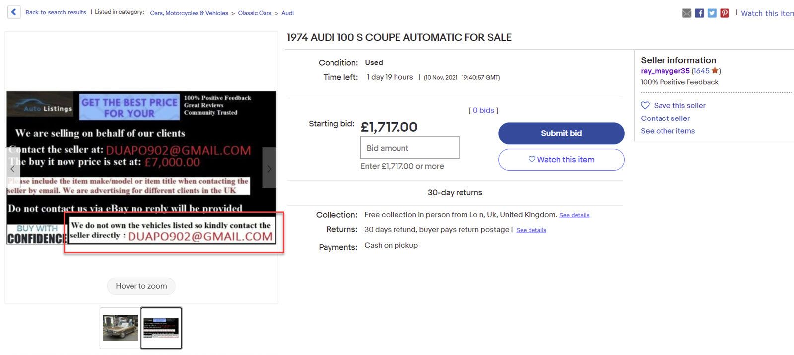 There are several variations on the scam, but a few common trends - most notably that the scammers often use compromised eBay accounts to advertise cars for sale that they don't really have and they attempt to get the buyer to make payment off the platform in some way (cash, gift cards, wire transfers etc.).